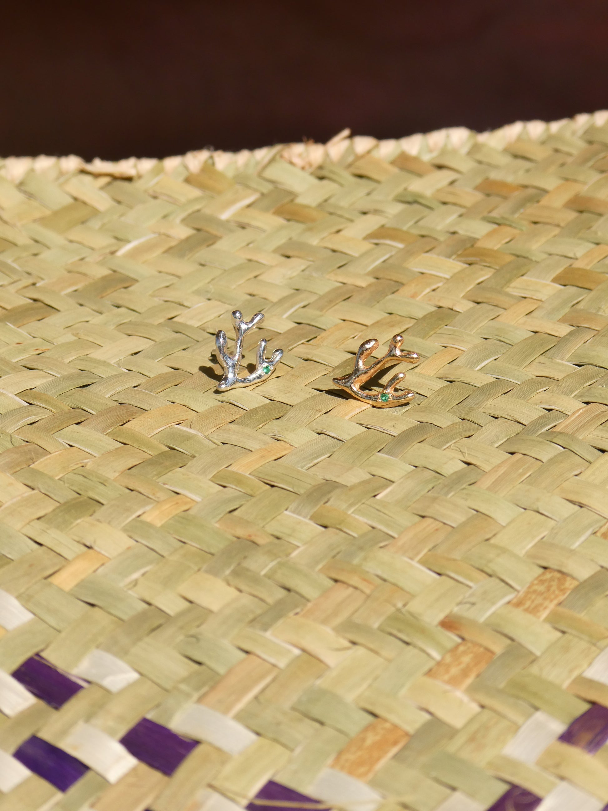 A meaningful earstud in the shape of a coral with an emerald gemstone. Sold per piece.
