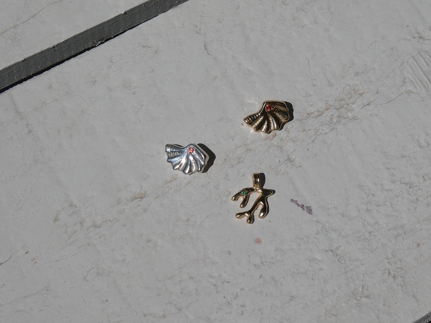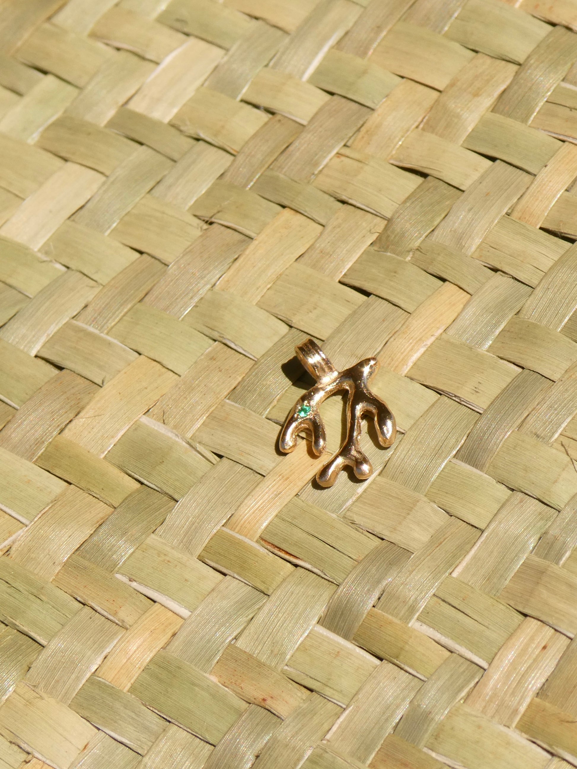 A meaningful pendant in the shape of a coral with an emerald gemstone.